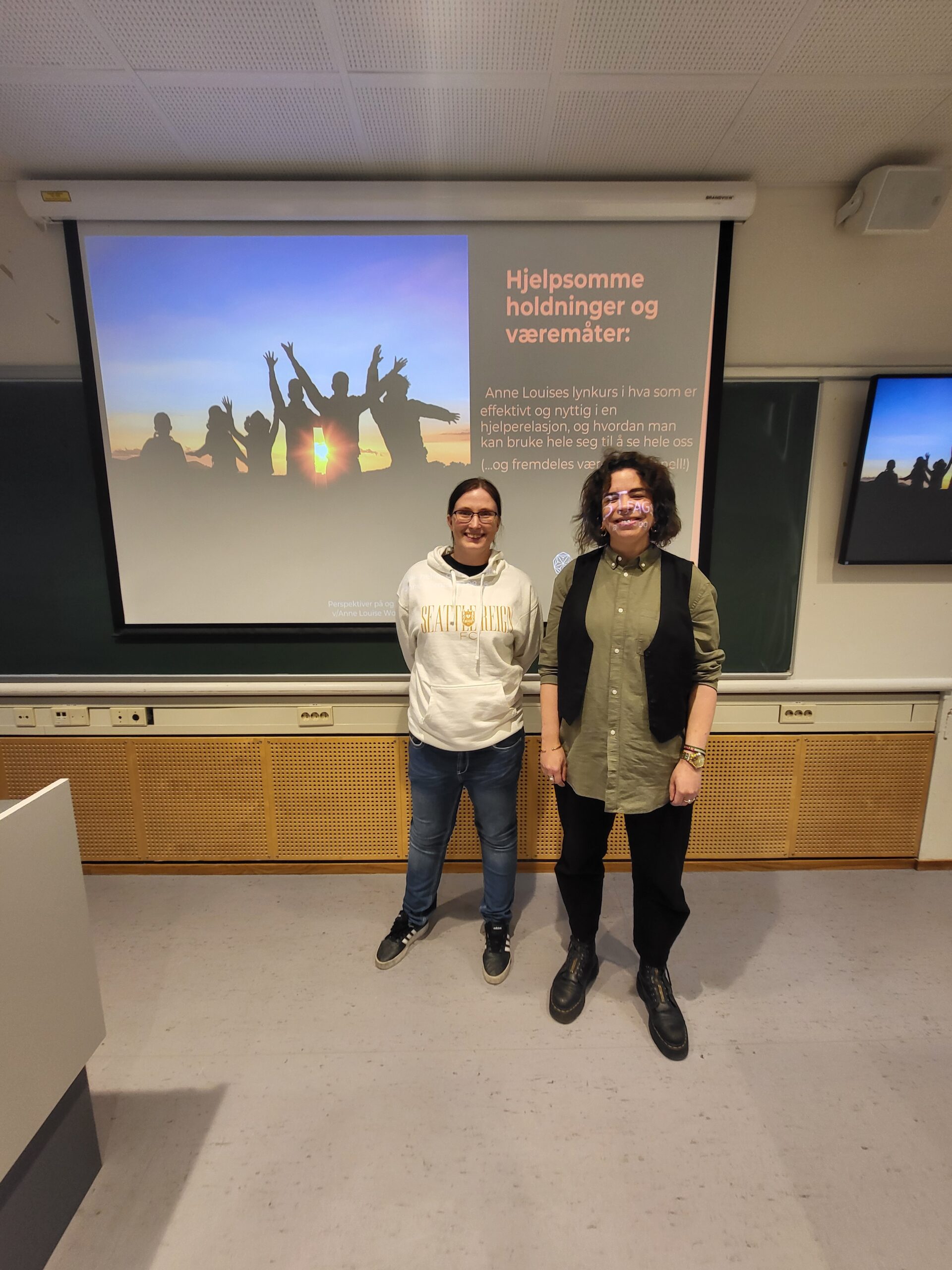 I august hadde erfaringskonsulentene Yvonne og Anne Louise forelesning for studenter ved NTNU. De delte perspektiver på og fra psykisk helse- og rusfeltet. Her fortalte de om erfaringer fra et brukerperspektiv, muligheter og hindringer (Yvonnes optimale drømmetjenester) og hjelpsomme holdninger og væremåter (Anne Louises lynkurs i hva som er effektivt og nyttig i en hjelperelasjon). Tilbakemeldingene var blant annet at det var nyttig, flinke folk som engasjerer og at det opplevdes som viktig. (Foto: Nina Reed v/NTNU).