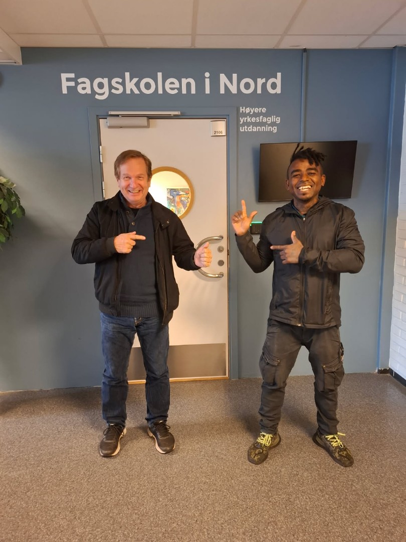 Rektor Karl Johan sammen med tidligere student, Mickael utenfor Fagskolen i Nord i Tromsø i starten av august. Med nytt studiested i Tromsø ser vi hvordan vi kan samarbeide med de ressursene som finnes i regionen. Mikael er for øvrig en engasjert mann med mange jern i ilden, og er vararepresentant i styret til KBT Fagskole.