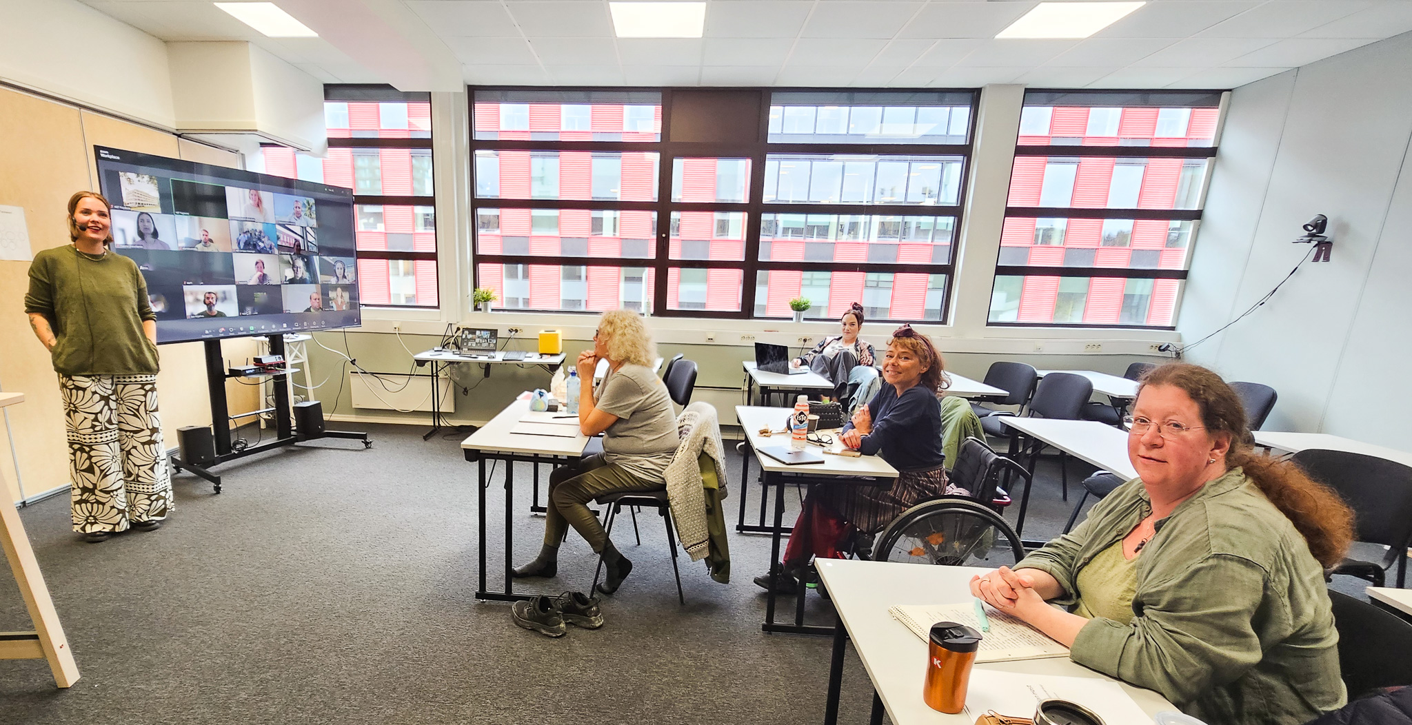 Bilde fra undervisningsrom i Trondheim. På en skjerm i hjørnet ser vi studentene som deltar digitalt. I rommet står lærer Sara og studiekonsulent Olga. Fire kvinnelige studenter sitter ved pulter og ser mot kamera.