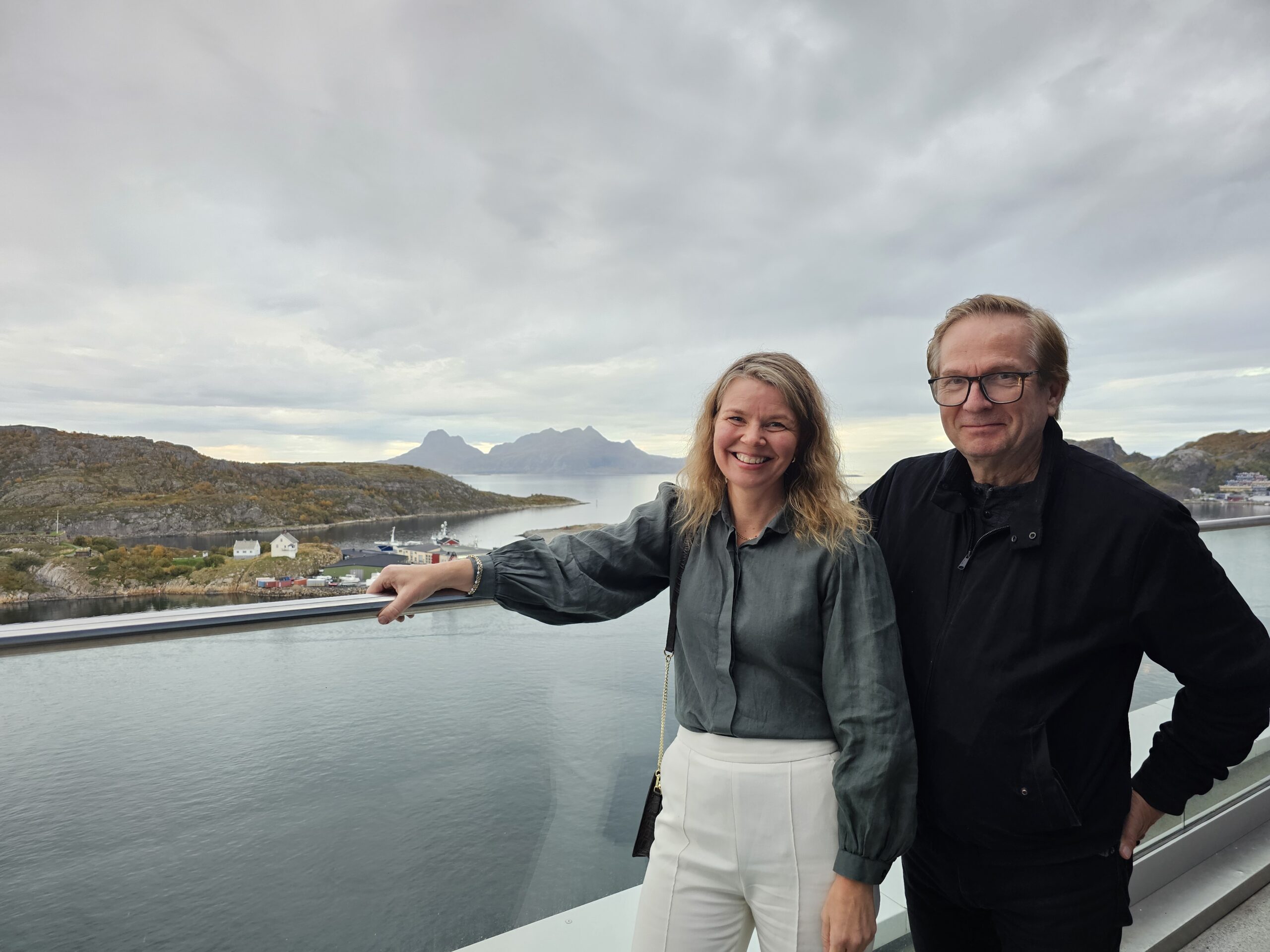 1. oktober var det duket for Interreg NPA-konferanse i Bodø, hvor prosjektet MERSE ble presentert. Før det offisielle programmet startet, rakk vi en liten sightseeing-tur. På bildet: Veronica fra Eikra Aktivitet (deltaker i MERSE-prosjektet) og Karl Johan Johansen fra KBT Fagskole.